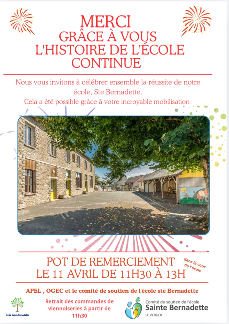 Le comité de soutien invite le samedi 11 avril à partir de 11h30, à l’issue des portes ouvertes de l’école, à un pot de remerciement toutes les personnes qui se sont mobilisées et qui ont contribué au maintien de la troisième classe par un geste, leur témoignage ou leur signature.